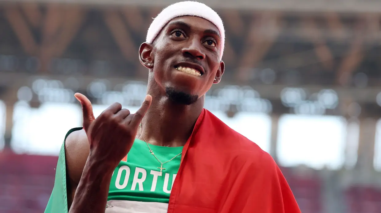 Momento em que nelson evora recebe a medalha de ouro e que se ouve a portuguesa nelson evora. É um atleta de alto nível internacional que, atualmente.